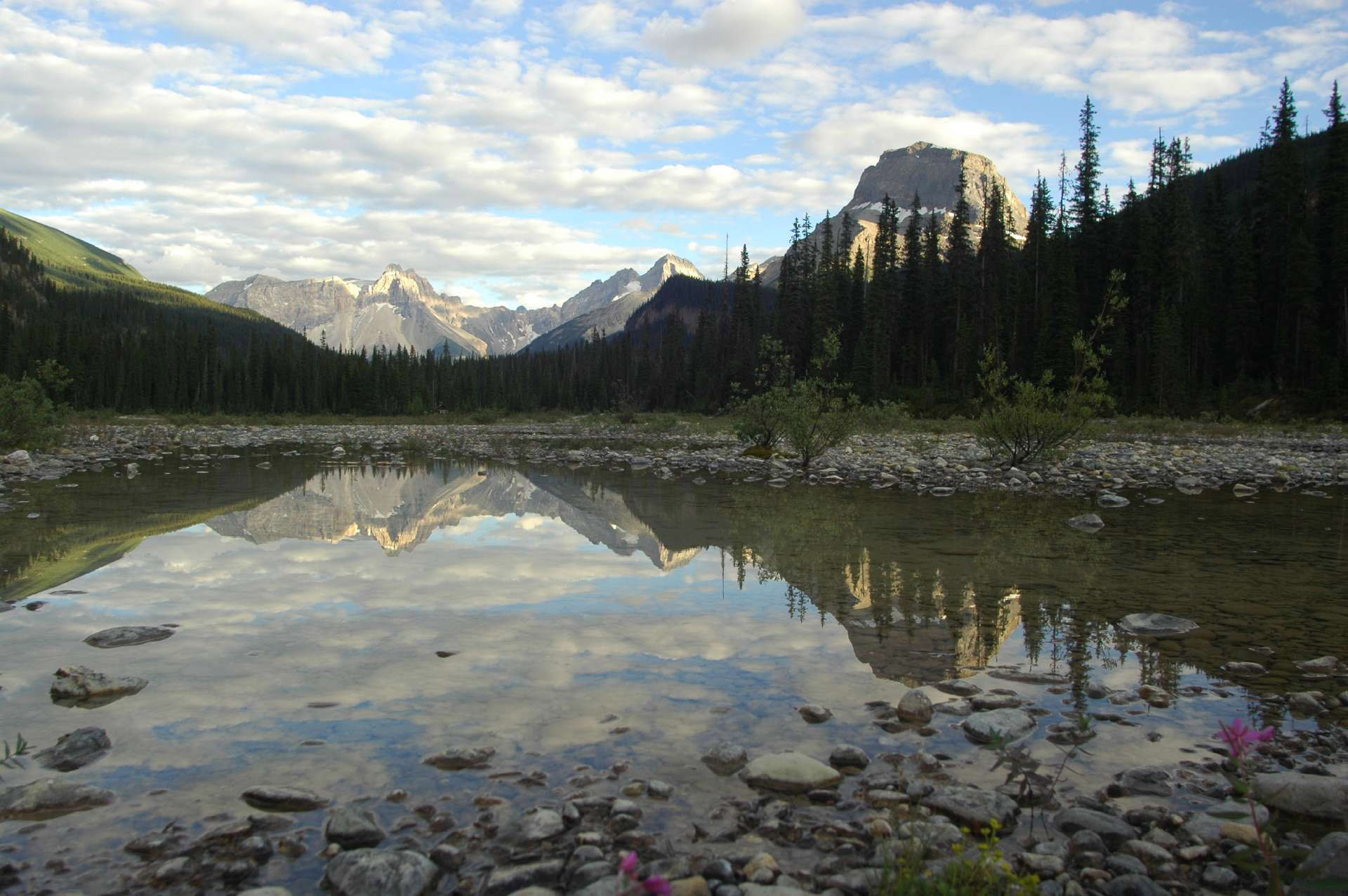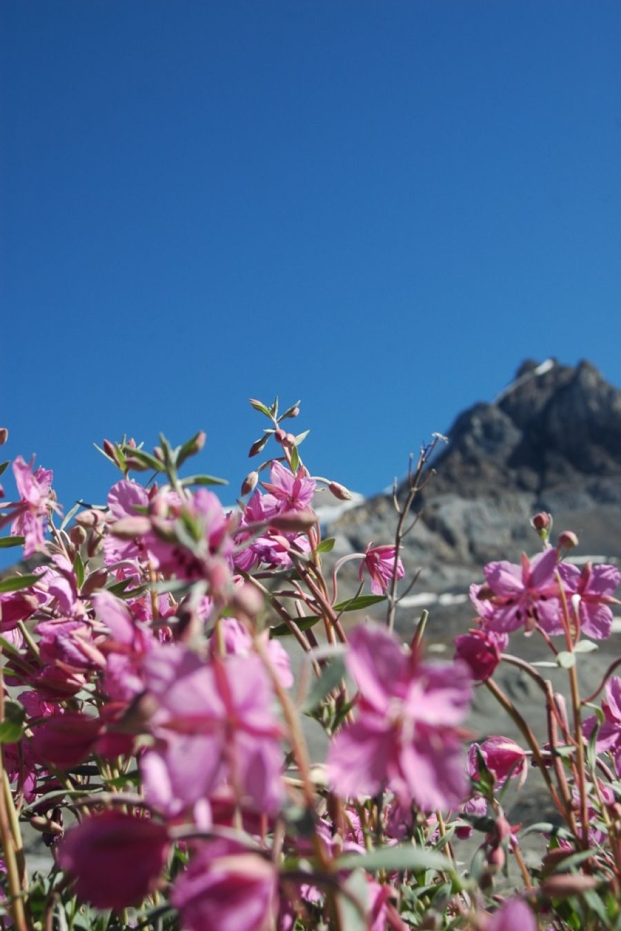 Grijze grote bergen met witte toppen en hier en daar vrolijke roze bloemen. Prachtig!