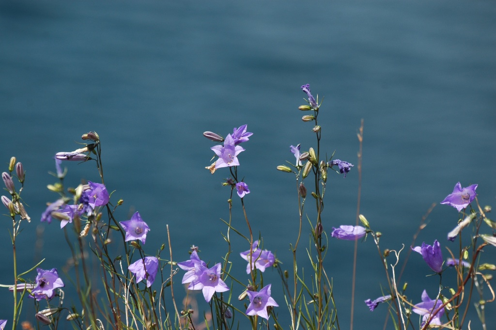 Grijze grote bergen met witte toppen en hier en daar vrolijke roze bloemen. Prachtig!