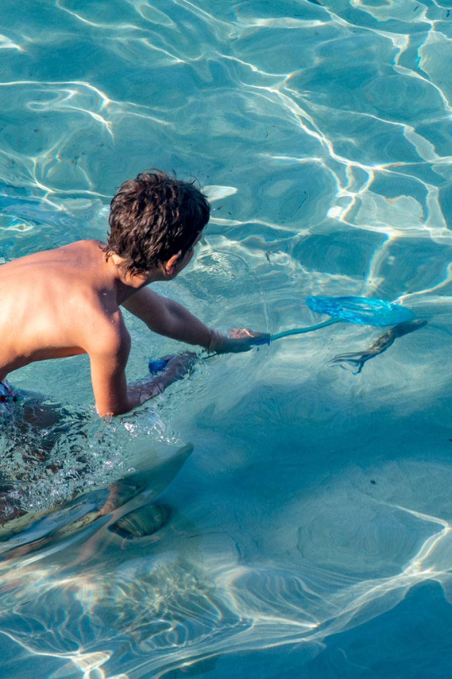 De jongen hiernaast vangt een inktvis, vlakbij waar de meiden aan het zwemmen zijn, en laat hem daarna weer vrij. Beetje spannend voor de meiden maar mooi te zien hoe ze zwemmen.